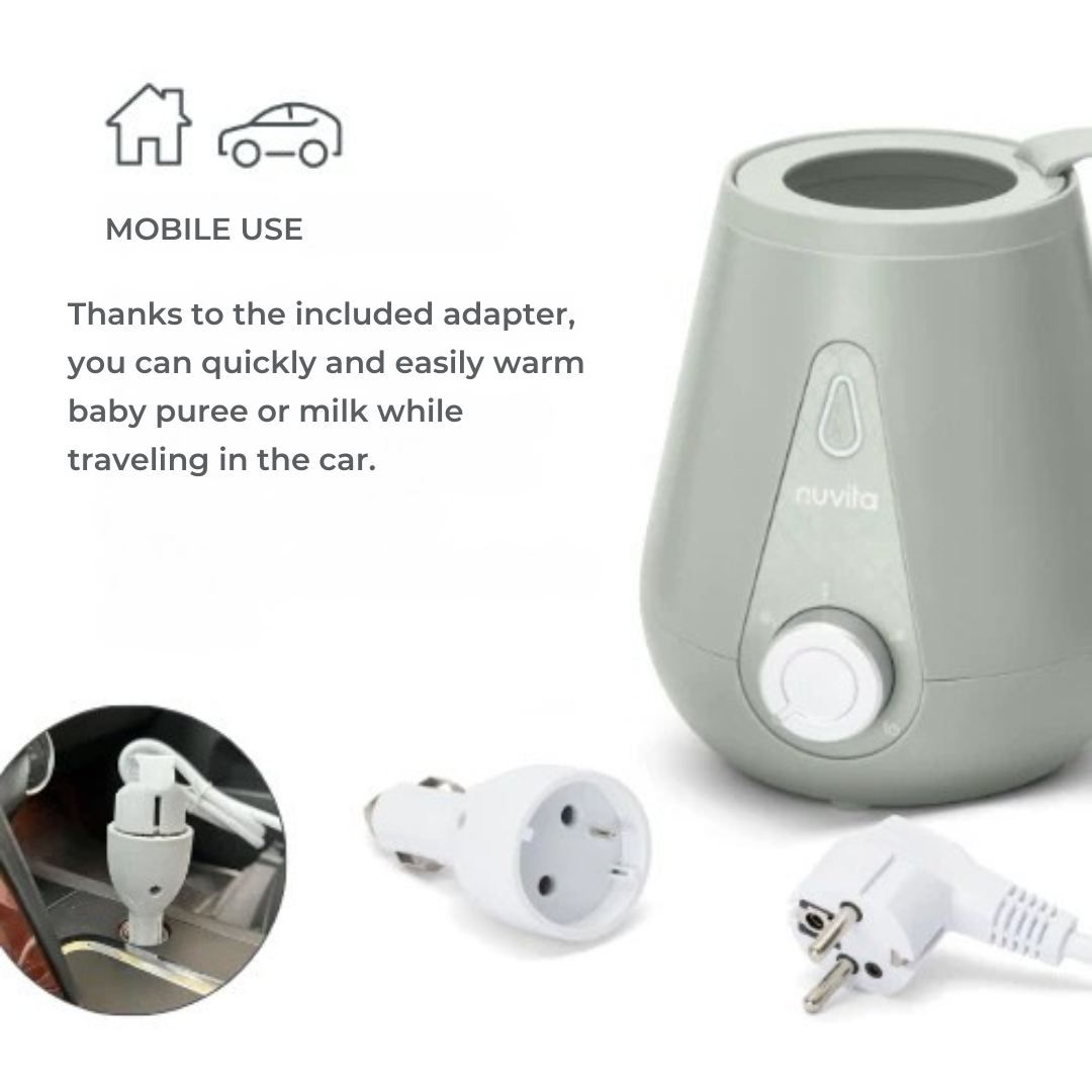 Nuvita 1165 Преносим нагревател за шише за дома и колата е практично и надеждно решение за затопляне на бебешко мляко и храна у дома или по време на път. Със своя компактен дизайн и широк отвор от 8,5 см, уредът е съвместим с всички стандартни шишета и бурканчета.