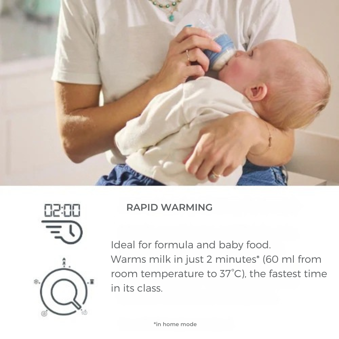 Разполага с 4 лесни за използване програми: бързо затопляне (само 2 минути за 60 мл мляко), затопляне на бутилки, подгряване на храна и нежно размразяване – подходящо за кърма, без загуба на хранителни вещества.