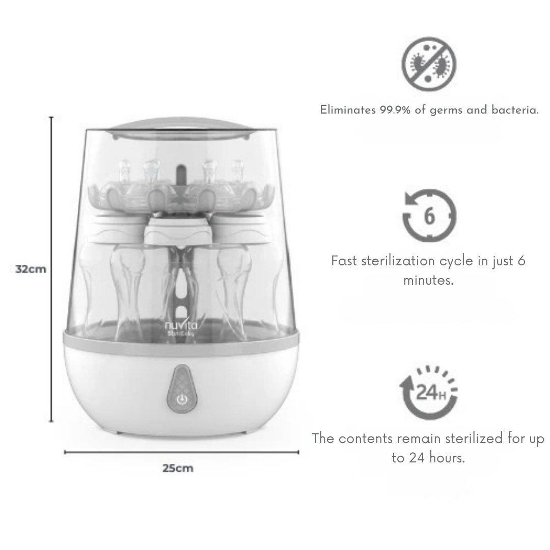 Nuvita SteriEasy е ултрабърз и безопасен електрически парен стерилизатор, който ефективно стерилизира до 6 шишета, биберони, помпи за кърма и аксесоари само за 6 минути. Идеален за ежедневна употреба, уредът поддържа стерилността до 24 часа, ако не се отваря капакът.