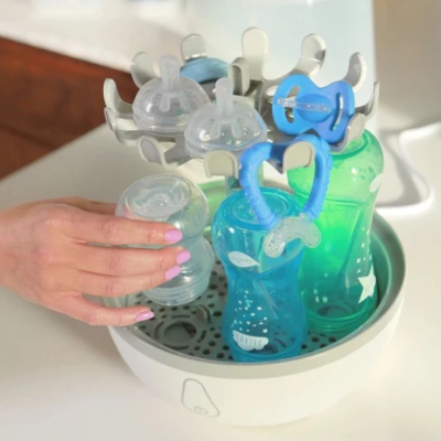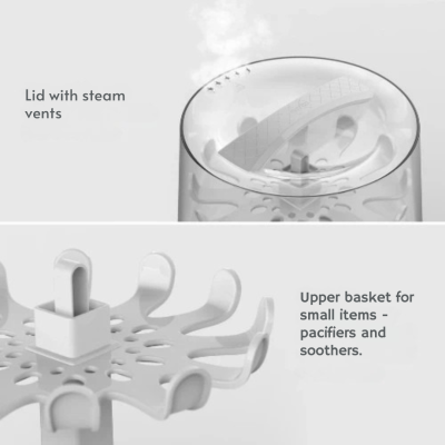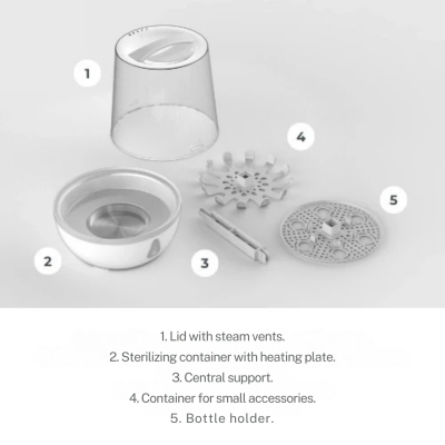 Стерилизаторът не съдържа BPA и използва мощна парна стерилизация, която елиминира 99.9% от микробите и бактериите без химикали. Оборудван е с издръжлива нагревателна плоча от неръждаема стомана и автоматично изключване за допълнителна безопасност.