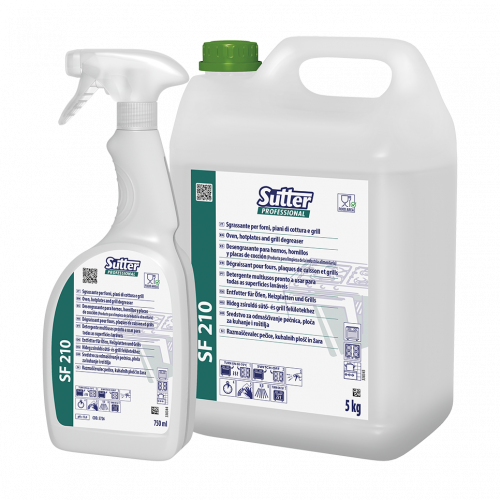 SF 210 – мощен обезмаслител за кухни, 750 мл, pH >13.0, създаден специално за ефективно премахване на изгорели мазнини от фурни, котлони, грил плочи и въртящи шишове. Този алкален препарат гарантира отлично прилепване към вертикални повърхности и дълбоко почистване на упорити замърсявания, натрупани при високи температури.