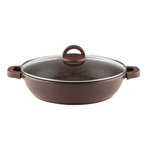 Плитка тенджера Muhler Mia MR-3275M – 4.3L, лят алуминий, мраморно покритие, 32x7.5 см. Подходяща за всички котлони и съдомиялна. Цвят: шоколад.