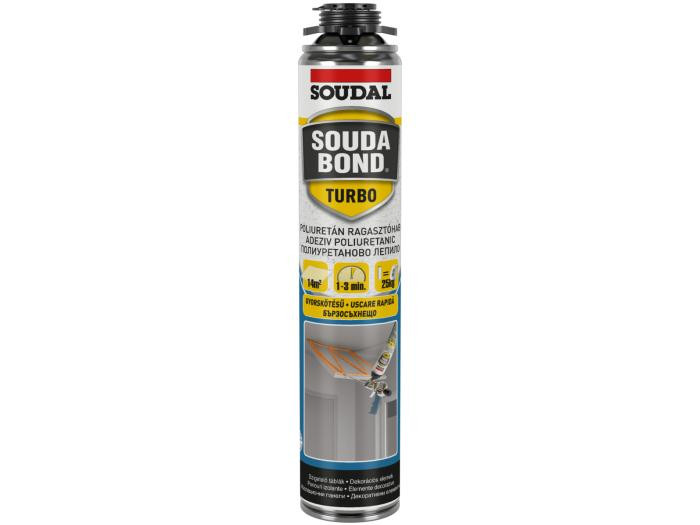 Полиуретаново лепило Soudal Soudabond Turbo 750 мл е бързосъхнеща пяна, подходяща за залепване на не много тежки елементи. То е перфектно за употреба към почти всички материали, като бетон, тухли, камък, дърво и метали. Не трябва да се използва върху полиетилен, полипропилен, политетрафлуороетилен и силикон. Подходящо е за вертикално приложение, тъй като не се разтича. Лепилото изсъхва супер бързо. На третата минута образува повърхностен слой, а на петнадесетата вече можете да продължите работата, като спестявате около 30% от времето си.