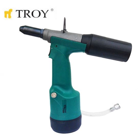Пневматична нитачка Troy е надежден инструмент с метален корпус и здрави челюсти. С хидравлично бутало за по-голяма сила. Удобна за работа с една ръка във всяка позиция. Нитачката е със сменяеми глави и работно налягане 81-85 PSI.