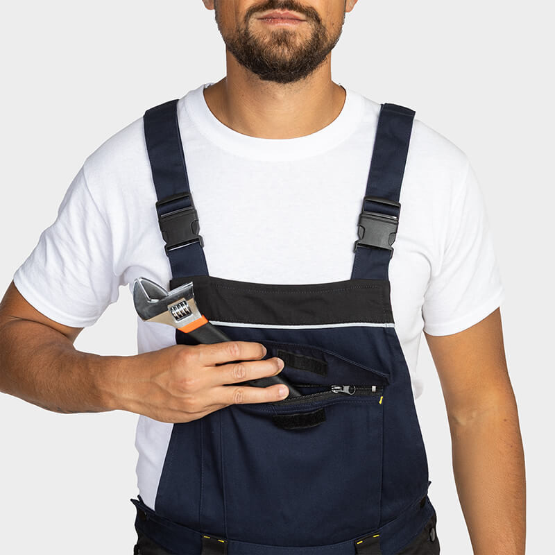 Работен гащеризон DAYTONA на B-WOLF – висококачествено работно облекло, създадено за комфорт, издръжливост и свобода на движение. Изработен от 97% памук и 3% еластан с плътност 240 г/м². Подсилените зони на коленете и крачолите от Oxford 600D осигуряват по-голяма устойчивост на износване. Моделът разполага с множество функционални джобове, джобове за наколенки и частично еластични презрамки. Светлоотразителните елементи RE-FLECT подобряват видимостта при работа. Подходящ за строителство, монтажни и сервизни дейности.