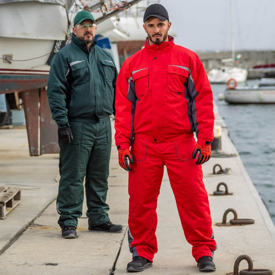 Зимен ватиран работен комплект – яке и полугащеризон за максимален комфорт и защита при ниски температури. Якето разполага с два странични и два нагръдни джоба с капаци, вътрешен джоб, регулируеми ластични маншети и светлоотразителни елементи. Полугащеризонът включва странични, нагръден и заден джоб, регулируеми презрамки, ластик в кръста и странично закопчаване с копчета. Изработен е от 100% памук с хидрофобна обработка (240 г/м²), полиестерна вата и хастар. Сертифициран по EN ISO 13688. Идеален за зимна работа на открито.