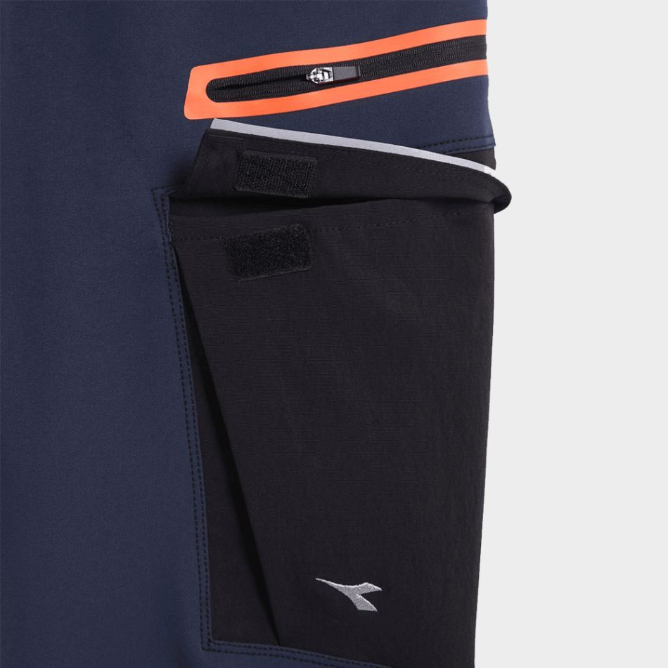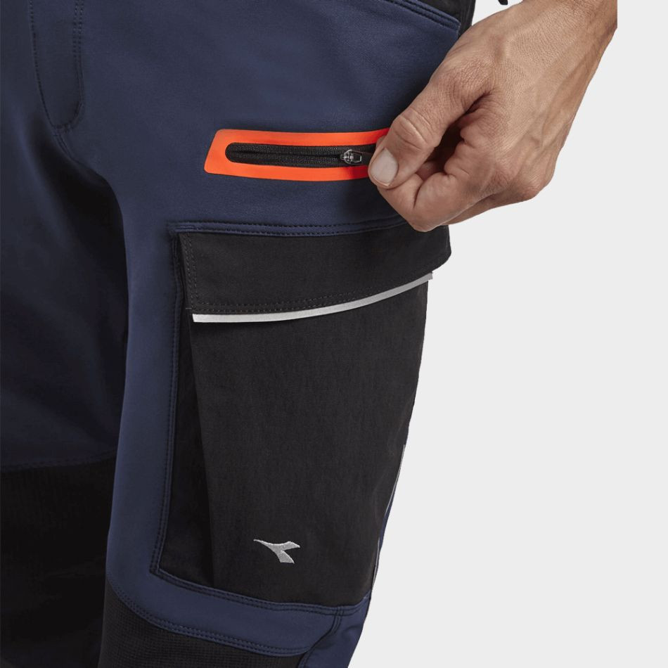 Работен панталон DIADORA PANT HYBRID CARGO – еластичен карго панталон от смесени тъкани за максимален комфорт и издръжливост. Разполага с еластична талия, два големи карго джоба с цип и велкро, страничен цип с контрастна термозапечатана неонова лента. Устойчиви на износване вложки, светлоотразителни детайли и регулируема дължина на крачолите. Подходящ за професионална работа, с вложки за наколенки и долната част на крачола за допълнителна защита. Материали: 54% полиамид, 39% полиестер, 7% еластан (230 г/м²); Taslan 95% полиамид, 5% еластан (270 г/м²). Сертифициран EN ISO 13688.