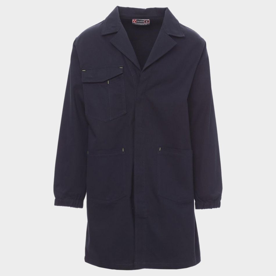 Работна престилка PAYPER SHELL тип манта с класическа ревер яка, създадена за удобство и професионална визия в работна среда. Моделът е с практично закопчаване с копчета и еластични маншети за по-добро прилягане и свобода на движение. Разполага с два удобни странични джоба и функционален нагръден джоб с капак и велкро закопчаване, подходящ за смартфон, бадж и химикалка. Изработена от 100% памук с висока плътност 260 г/м², престилката осигурява издръжливост и комфорт при продължително носене. Подходяща за различни професионални среди, отговаря на стандарт EN ISO 13688 за работно облекло.