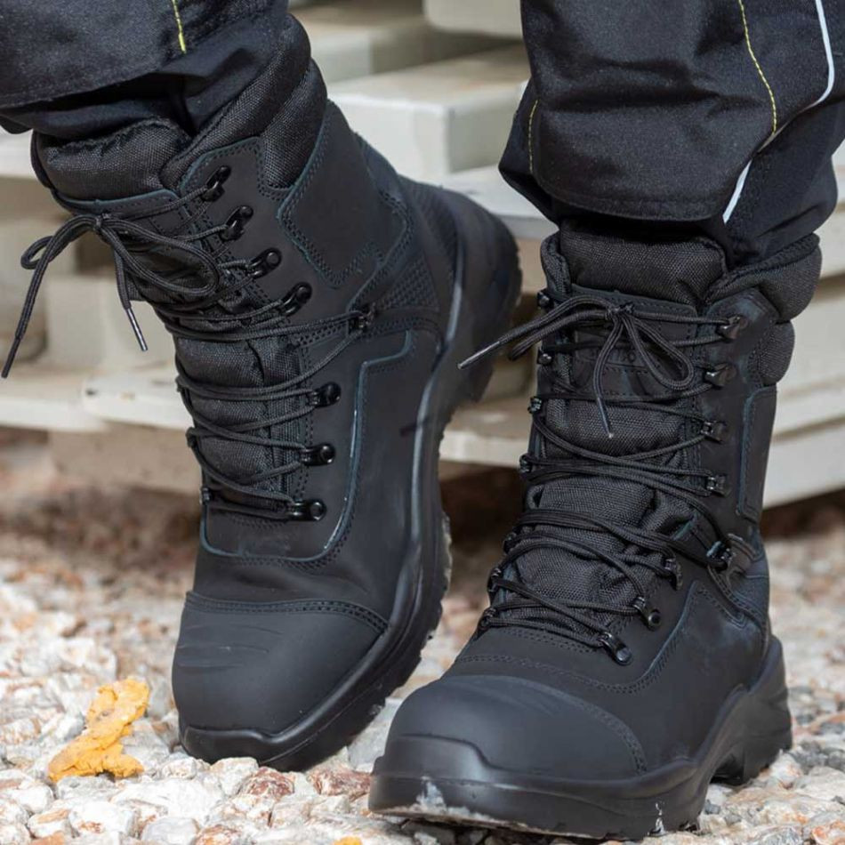 Работни боти HARLEY S6 WR FO SR BLACK предлагат надеждна защита и висока издръжливост за интензивна ежедневна работа. Моделът е изработен от водоотблъскващ набук с устойчив TPU, осигуряващ дълъг живот и стабилност. Дишащата текстилна подплата и PU стелка гарантират комфорт през целия ден. Композитното бомбе защитава стъпалото без да утежнява обувката. PU/PU ходилото предлага отлично сцепление и устойчивост на хлъзгане, подходящо за строителни, логистични и производствени среди. Отговаря на стандарт EN ISO 2345:222, което гарантира високо ниво на безопасност.