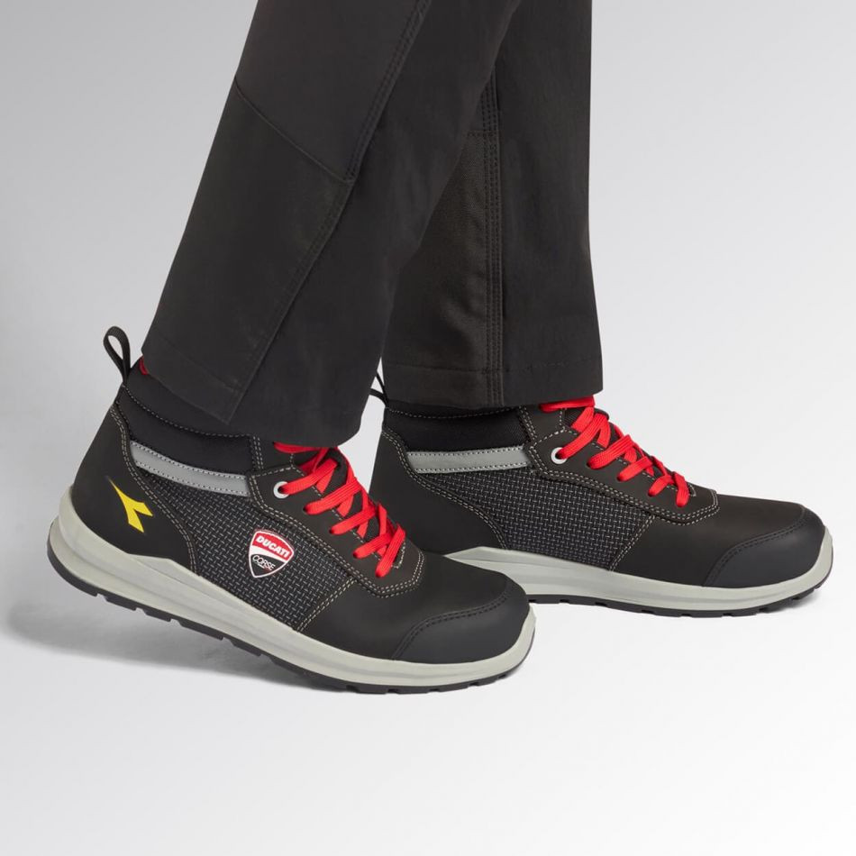 Високи защитни обувки Ducati Corse със спортен стил и максимална безопасност. Здрава велурена кожа със защитно PU покритие и подсилен полиестер осигуряват издръжливост и защита на глезена. Мрежестата Air Mesh подлпата гарантира отлична вентилация, а подвижната дишаща PU стелка с микро перфорации и активен въглен осигурява комфорт през целия ден. Износоустойчивото PU ходило и многослойното бомбе, устойчиво на 200 J, гарантират сигурност при работа или активни дейности. Лека PU пластина допълва защитата. Съответства на стандарт EN ISO 20345:2011.