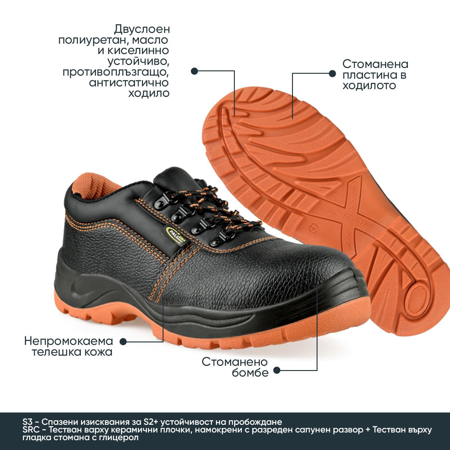 Работни защитни обувки Pallstar Viper S3 са категория S3 - със стоманено бомбе и стоманена бложка. Имат лицева част от Непромокаема телешка кожа и противохлъзгащо, антистатично, HRO ходило от гума, устойчиво на масла и киселини. Обувките се предлагат с размер от 36 до 47.