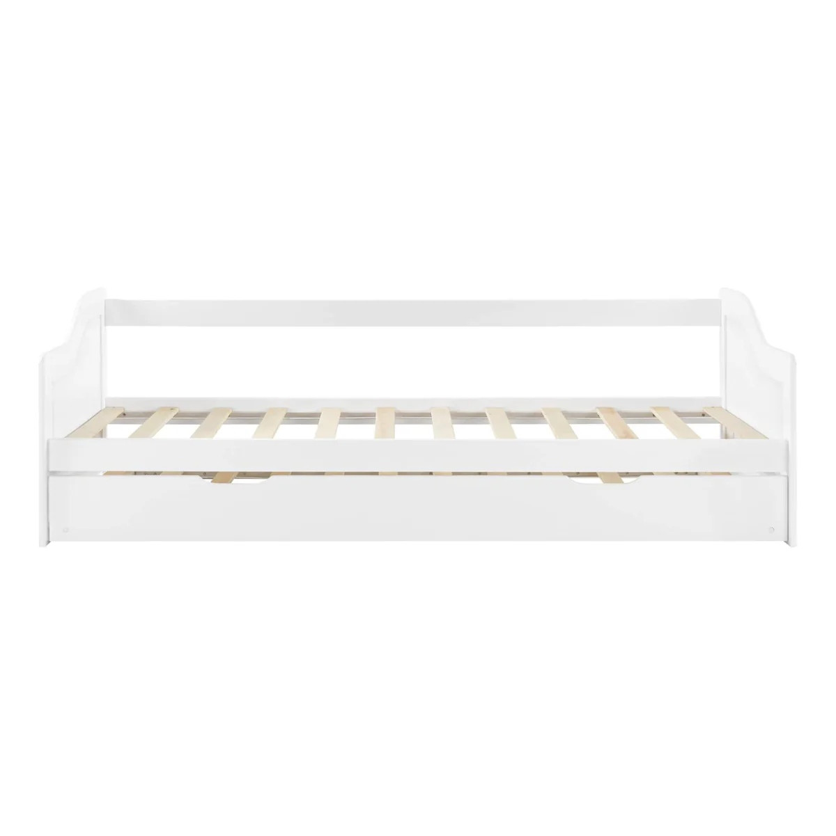 TRADDY е практичен разтегателен диван от масивна борова дървесина в бял цвят, подходящ за детска стая. Дизайнът с ниска облегалка и елегантни подлакътници съчетава стил и удобство. Побира матрак 190x90 см и разполага с второ плъзгащо се легло със същия размер, което осигурява допълнително място за сън. Боядисан е с безвреден лак на водна основа и е напълно нетоксичен. Здрава конструкция, лесна поддръжка и функционалност за ежедневна употреба.