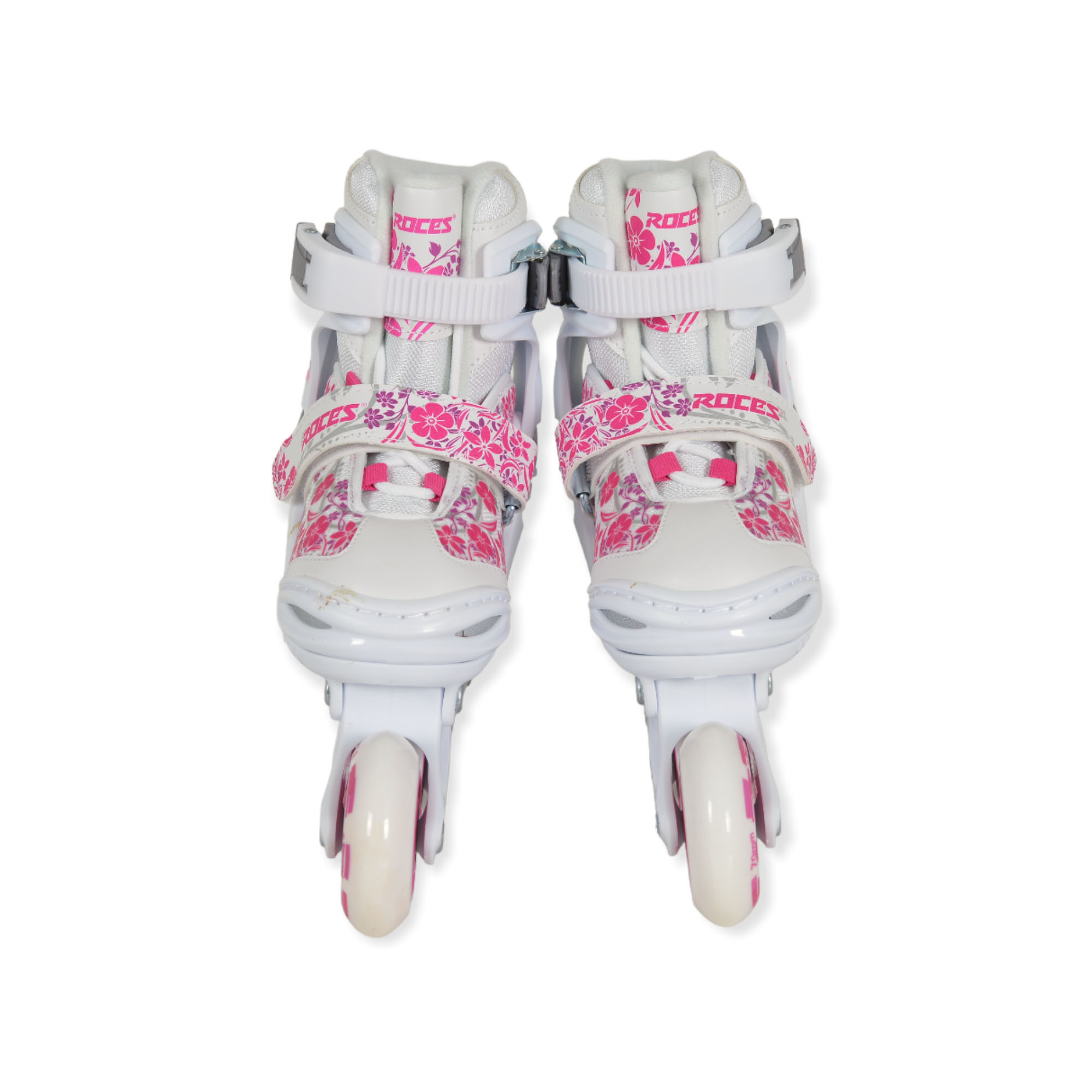 Ролери Roces Compy white са подходящи за деца на възраст над 3 години и тегло до 60 кг. Тези детски ролери имат 4 PU колела с размер 64х24мм(за размер 30-33); 70х24мм(за размер 34-37); 72х24мм(за размер 38-41); с лагери ABEC-3, които имат възможност за поставяне в три положения. Този модел е снабден със система за регулиране на размера според дължината на ходилото – от 18.2 до 19.7 см (ролери 30-33), от 20.5 до 22.2 см (ролери 34-37), от 24.5 до 26.8 см (ролери 38-41),. Кънките са с лека пластмасова основа и спирачка TPR. Закопчаването е с връзки, Velcro лента и двойно подсигурена катарама.
