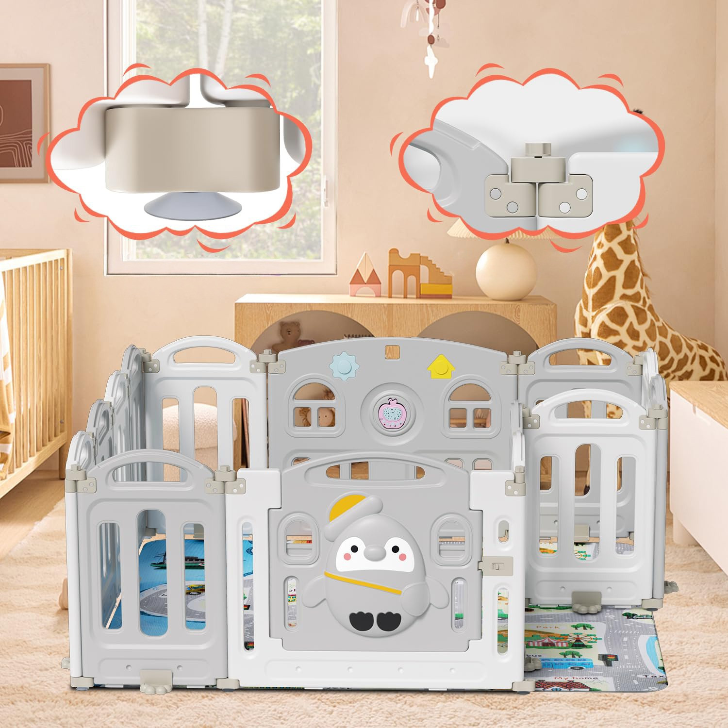 Ограда сгъваема 150/150 с музикален панел Penguin – комплект 12 + 2 части е практично и безопасно решение за детски игри. Размерът 150 x 150 см осигурява достатъчно пространство. Включва 50 цветни топки, XPE килимче с дебелина 1 см и панел с пингвинче и приказки. Работи с 2 x AA батерии (не са включени). Сгъваемата конструкция позволява различни конфигурации и лесно съхранение. Вратичката е със заключване чрез двойна катарама и бутон за сигурност. Вендузите гарантират стабилност върху различни повърхности. Продуктът съчетава комфорт, функционалност и забавление, като създава организирано място за игра. Произведен е по европейски стандарти EN 71-1:2014+A1:2018, EN 71-2:2020 и EN 71-3:2019+A1:2021.