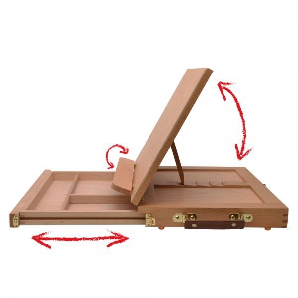 Статив за рисуване Артина Кале 36 х 28 х 30 см може да се използва и за чертожна дъска. Изработен е от букова дървесина, има пространство за съхранение на пастели, моливи, четки бои и др. Наклонът на работното поле може да се фиксира в пет позиции. Стативът има удобна поддръжка, която улеснява пренасянето и гумени крачета, които осигуряват стабилност при експлоатация.