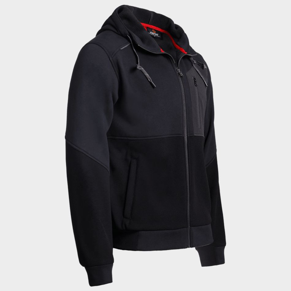 Суитшърт FLEX PRO BLACK – функционален работен суитшърт с качулка, изработен от здрава и комфортна джогинг материя, идеален за хладно време. Разполага с централен цип за бързо закопчаване, два странични джоба и нагръден джоб с цип за удобство и сигурност. Качулката е регулируема с връзки, а ластичните маншети и колан осигуряват перфектно прилягане. Материал: 67% полиестер, 33% памук, джогинг материя, 320 г/м². Сертифициран по EN ISO 13688, подходящ за работни дейности, спорт и ежедневна употреба. Комбинация от комфорт, издръжливост и функционалност.