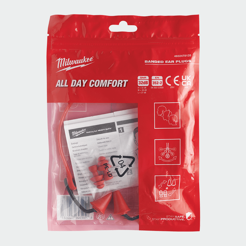 Тапите за уши MILWAUKEE M Banded Ear Plugs осигуряват надеждна защита от шум в индустриална и строителна среда. Те са създадени с твърда свързваща лента, която позволява три различни начина на носене – над главата, под брадичката или зад врата – според нуждите и удобството на потребителя.