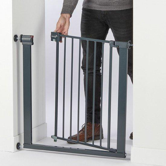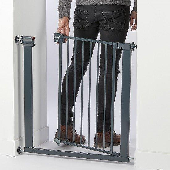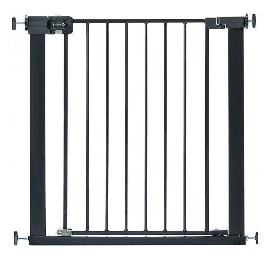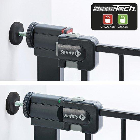 Металната преграда SAFETY 1st осигурява безопасност за деца от 6 до 24 месеца. Подходяща за врати и стълби, тя се отваря в една или двете посоки. Интуитивната дръжка позволява лесно отваряне с една ръка, а SecureTech® индикаторът показва безопасното заключване. Здравата стоманена рамка и 4 точки на монтаж гарантират стабилност без пробиване. Широкият отвор улеснява преминаването, а вратата се регулира за отвори от 73 до 80 см и може да се удължи до 108 см с допълнителни удължители. Лесна за монтаж и употреба.