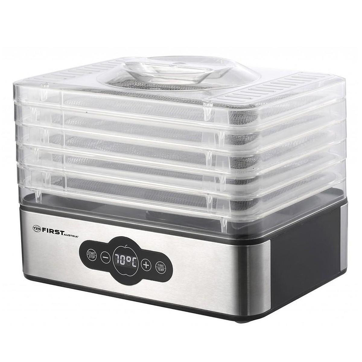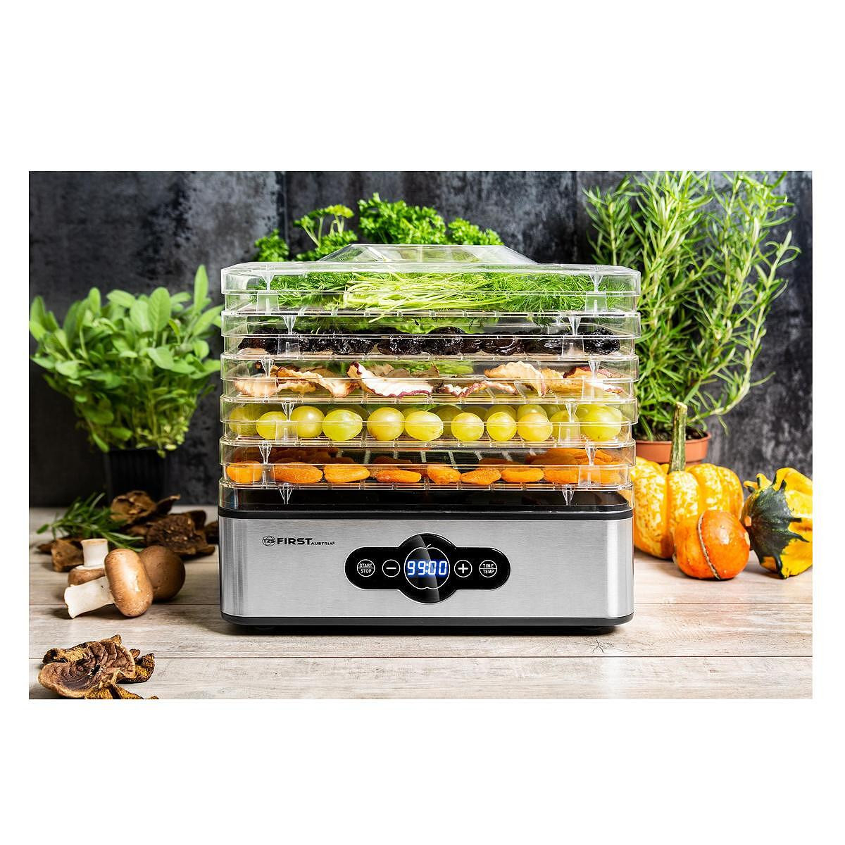 Уредът за изсушаване на плодове и зеленчуци FIRST FA-5126-6 предлага ефективна работа с мощност 200–240 W и пет слоя от неръждаема стомана и пластмаса. Моделът разполага с разглобяема мрежа, удобен дисплей и регулируема температура от 35 до 70°C, както и таймер за прецизен контрол. Компактните размери 30 x 22 x 27,5 cm и тегло 2,4 kg го правят подходящ за всяка кухня. FIRST FA-5126-6 е идеален за здравословно приготвяне на сушени плодове, зеленчуци, билки и други домашни продукти.