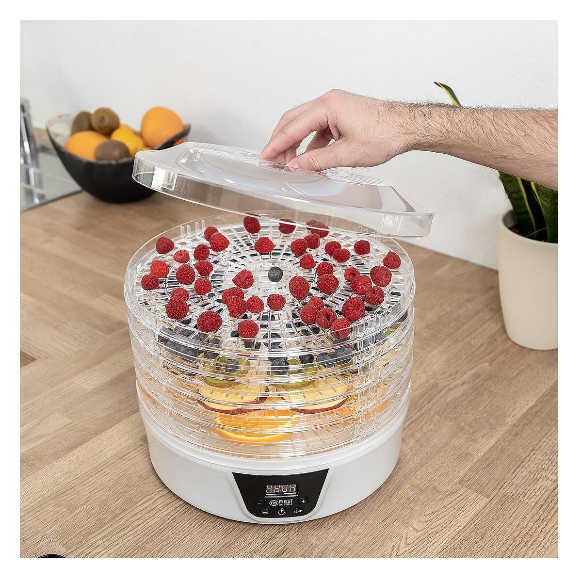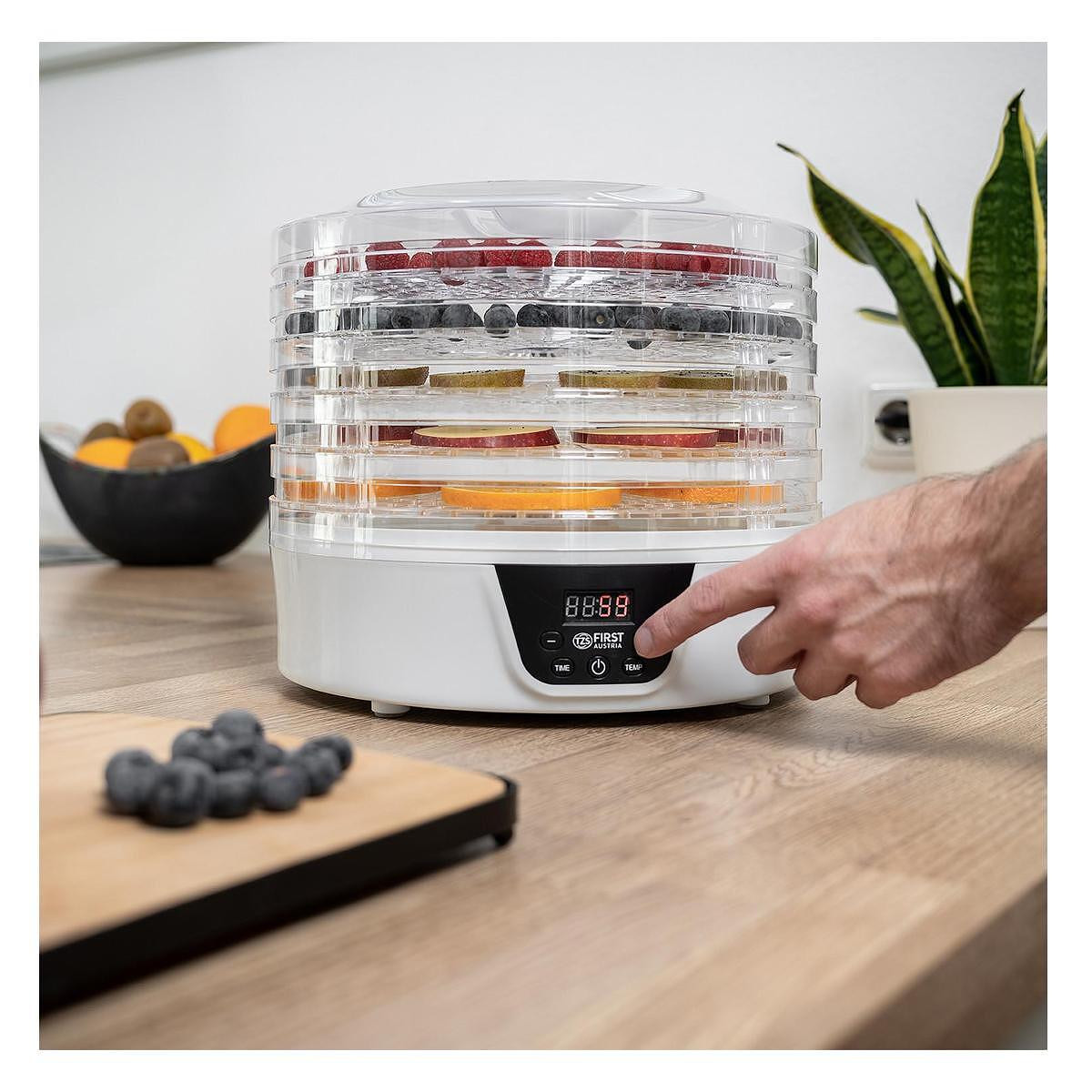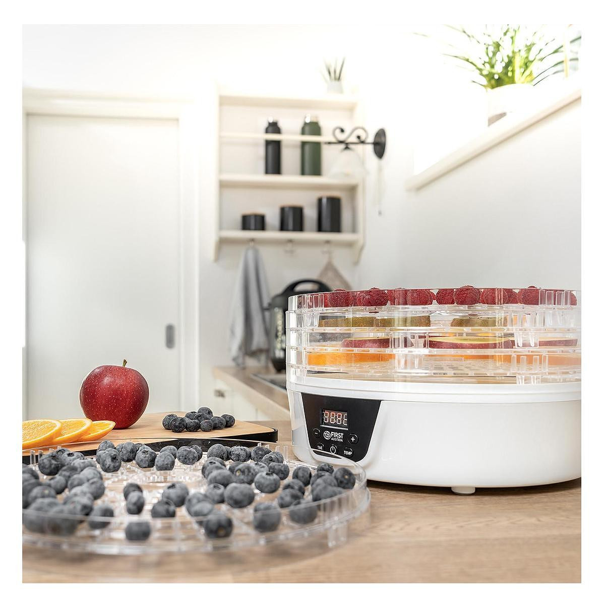 Уред за изсушаване на плодове FIRST FA-5126-8 с мощност 320-380 W и 5 пластмасови слоя. Разполага с дисплей, регулируема температура от 35 до 70°C с стъпка 5°C и таймер за удобно управление. Работи на 220-240 V, с компактни размери 29,5x26x29,5 см и тегло 1,8 кг. Цветове: бял и черен. Идеален за бързо и ефективно сушене на плодове и зеленчуци вкъщи. Оптимален избор за здравословно сушене с лесно управление и надеждна конструкция.