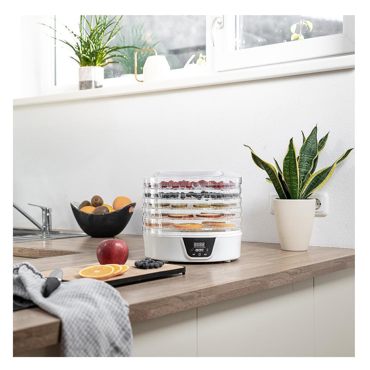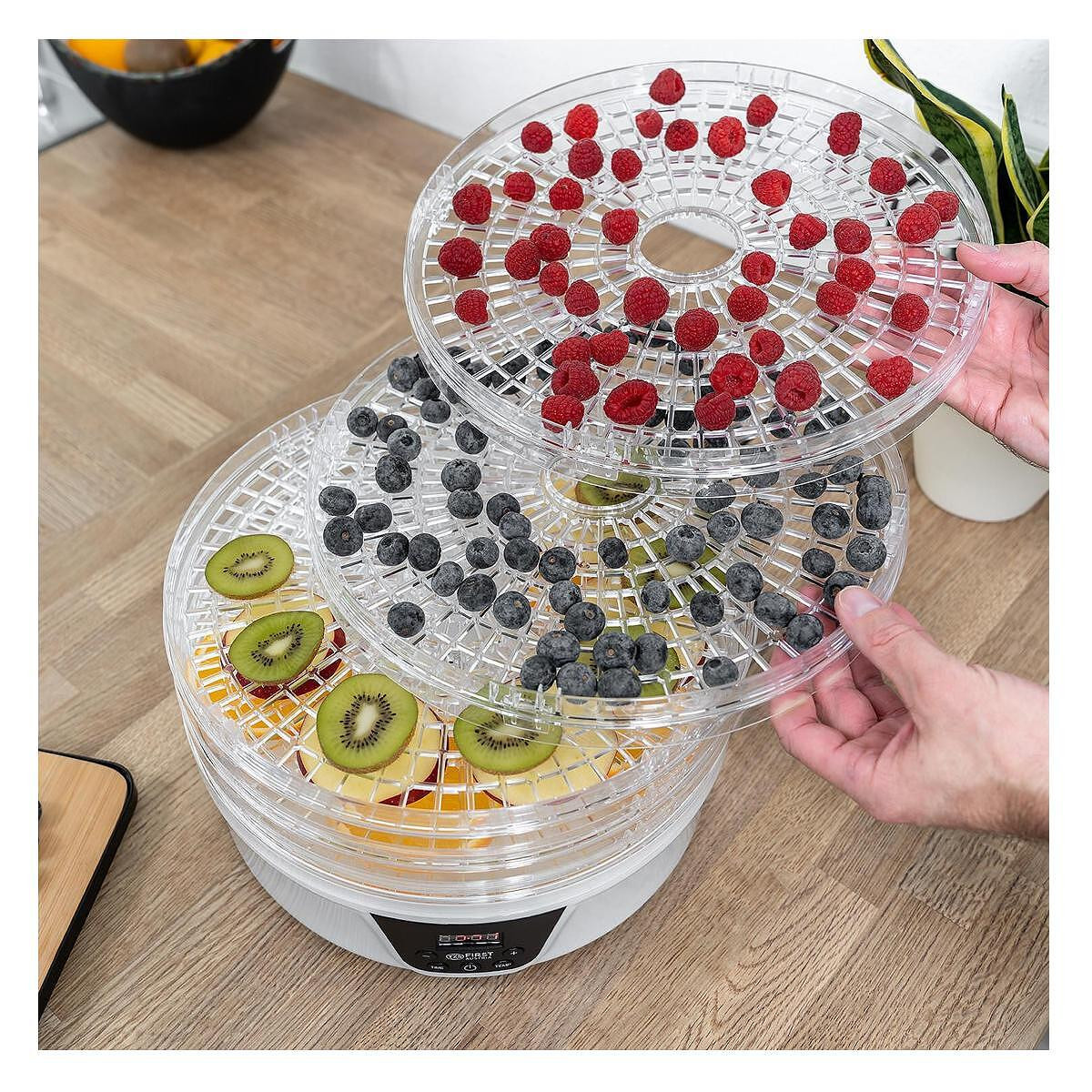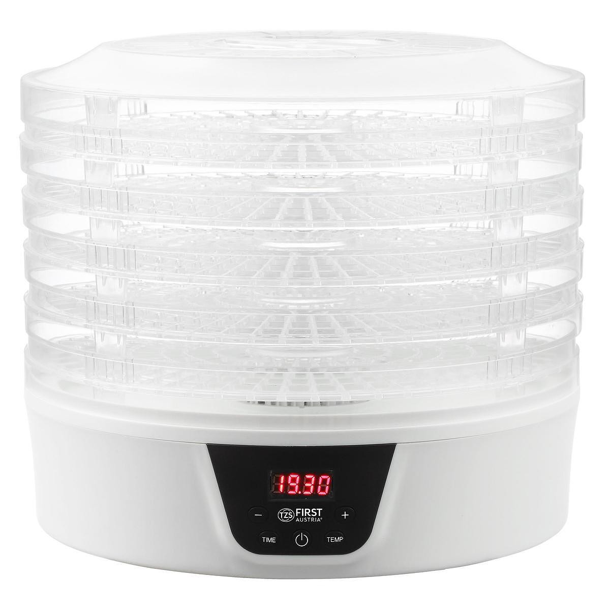 Уред за изсушаване на плодове FIRST FA-5126-8 с мощност 320-380 W и 5 пластмасови слоя. Разполага с дисплей, регулируема температура от 35 до 70°C с стъпка 5°C и таймер за удобно управление. Работи на 220-240 V, с компактни размери 29,5x26x29,5 см и тегло 1,8 кг. Цветове: бял и черен. Идеален за бързо и ефективно сушене на плодове и зеленчуци вкъщи. Оптимален избор за здравословно сушене с лесно управление и надеждна конструкция.