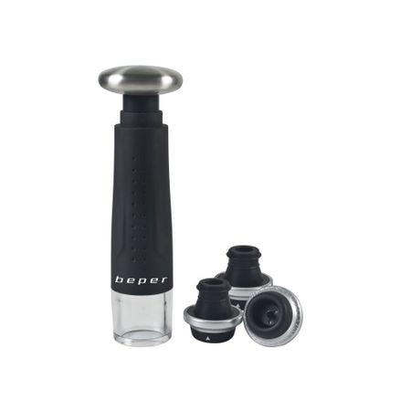 Вакуум помпа за бутилки Beper AV.037 запазете виното си свежо, така като е отворено, благодарение на тази иновативна вакуумна помпа. Можете да запечатате виното плътно, предотвратявайки окислението и по този начин позволявайки оптимално запазване. Включени са 3 силиконови тапи с индикатор за дата. Съвместим с всички бутилки.