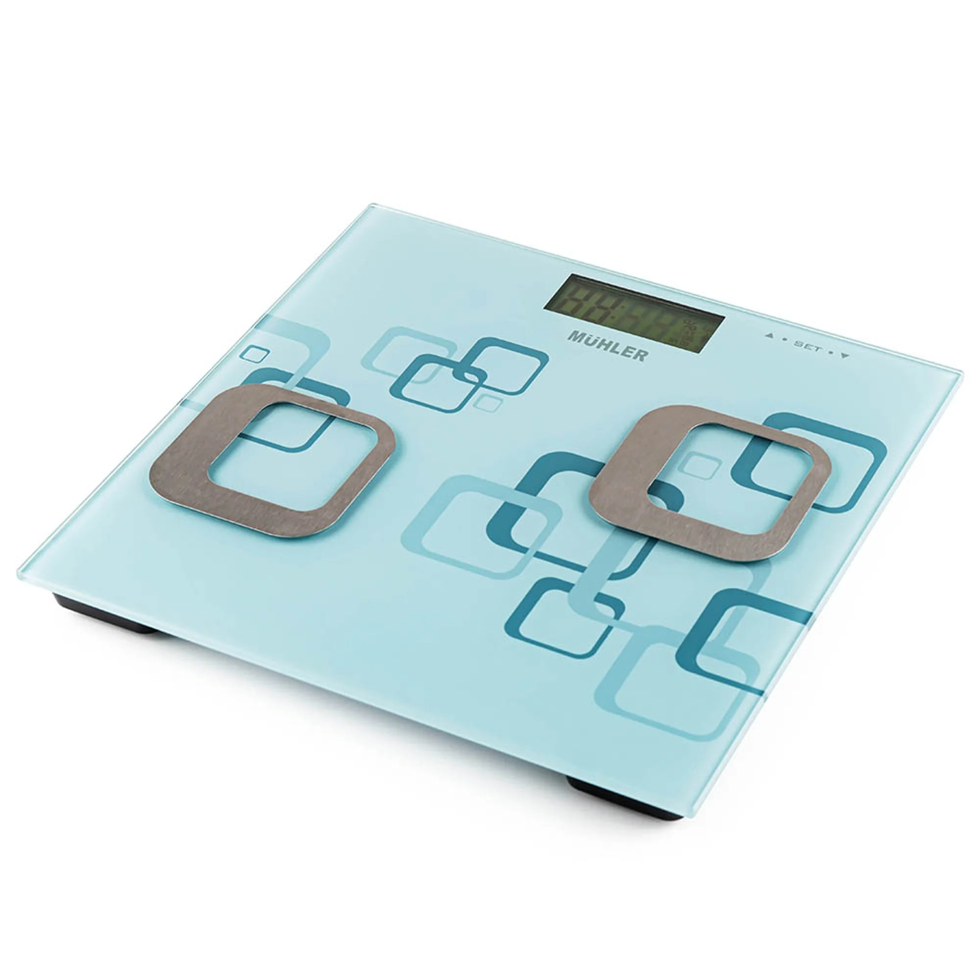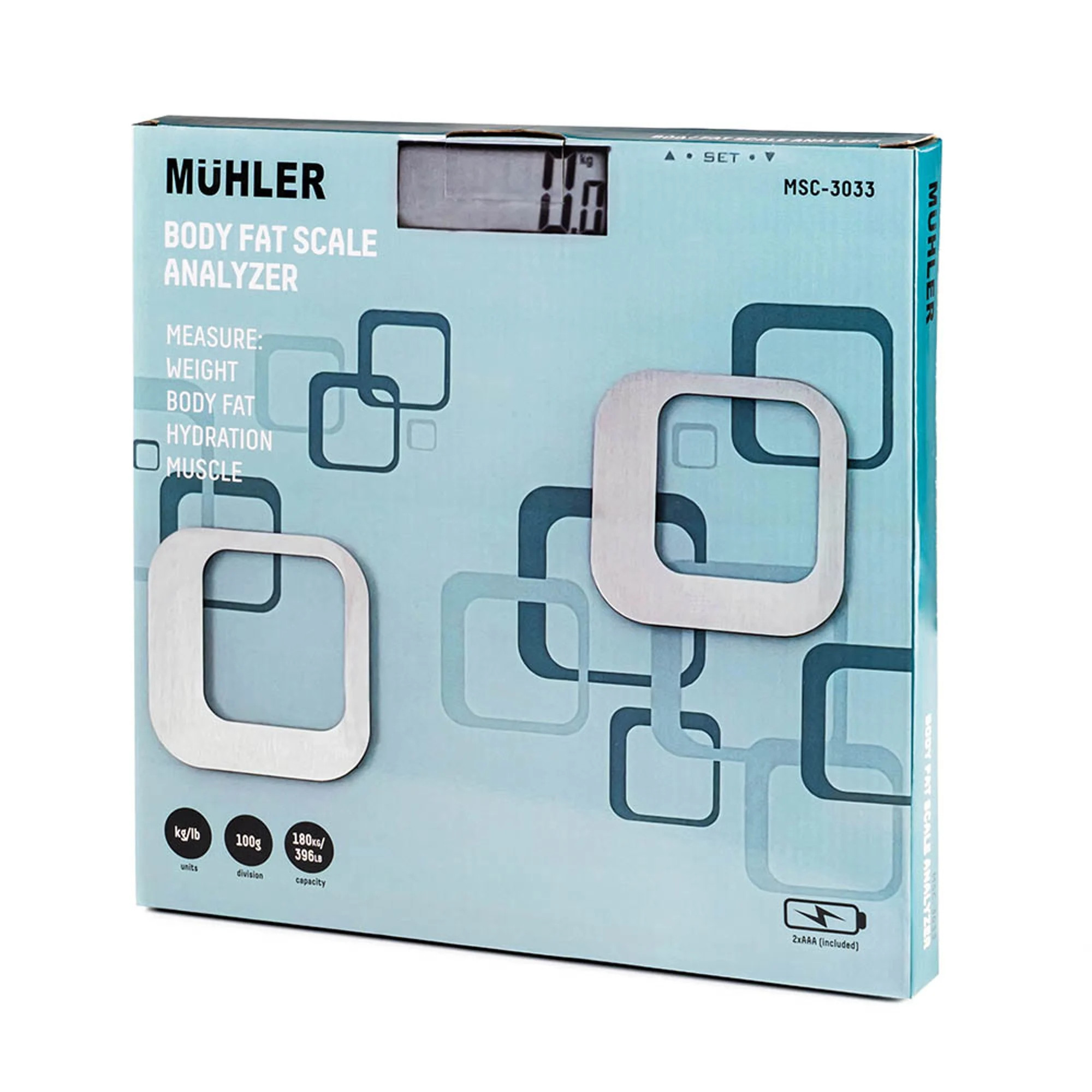Електронна везна-анализатор Muhler MSC-3033 е практично решение за контрол на здравето у дома. Поддържа измерване на тегло от 5 до 180 кг с точност 0.1 кг и избор на мерни единици kg/lb/st. Освен телесно тегло, отчита телесни мазнини, хидратация и костна маса. Разполага с голям LCD дисплей, памет за 12 потребителя, автоматично включване и изключване, както и индикация за претоварване и изтощена батерия. Стъклен корпус от 5 мм закалено стъкло.