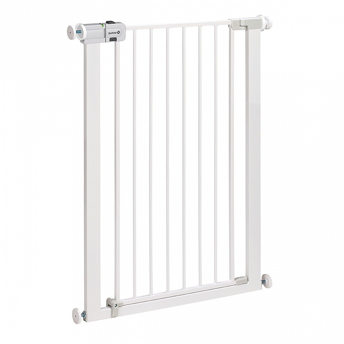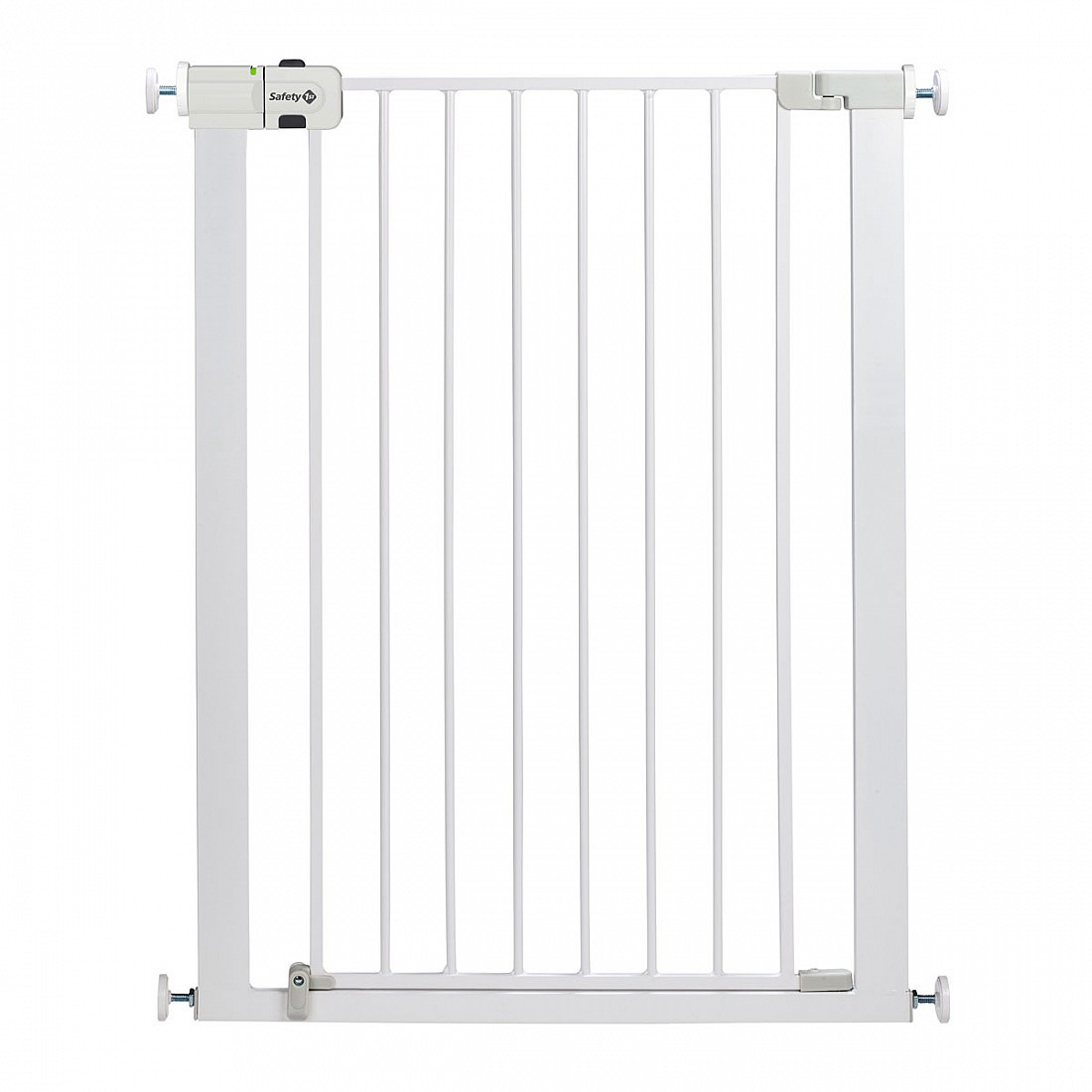 Универсална метална преградна врата с възможност за отваряне в една или две посоки. Лесен и удобен затварящ механизъм с визуален индикатор Secure Tech® за безопасно заключване. Вторичният заключващ механизъм осигурява защита дори при активни деца. Ергономична дръжка за отваряне с една ръка и широк отвор за удобно преминаване. Здрава стоманена рамка, регулируема ширина 73–80 см, удължима до 94 см с допълнителни удължители. Монтаж чрез натиск с 4 точки, без пробиване. Подходяща за деца 6–24 месеца, лесна за инсталиране и ежедневна употреба.